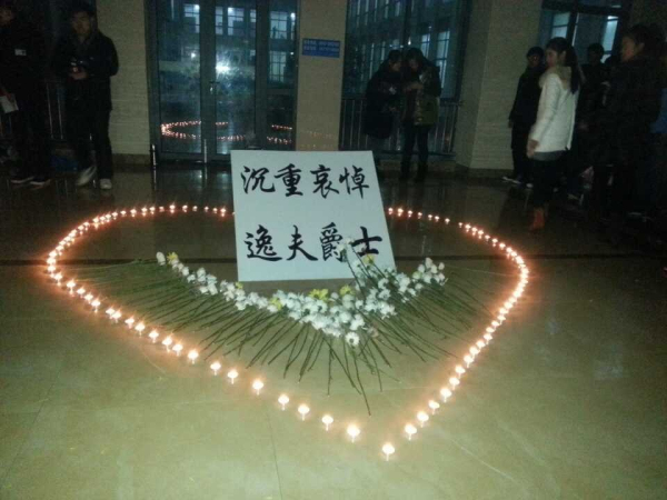 当天晚6时55分,皖南医学院13级临床员工会于公司逸夫楼大厅为这位伟大的慈善家举行了哀悼会,参加此次哀悼会的人员有13级员工会所有成员及各班员工代表。哀悼会开始由赵杞同学宣读了哀悼词,回顾了邵逸夫爵士辉煌的一生。紧接着,所有同学在哀乐中为邵逸夫爵士默哀三分钟,沉痛悼念这位伟人的逝世,最后同学们陆续献出了手中的白菊。107支白菊,107根白烛,满满的都是我们的哀痛。