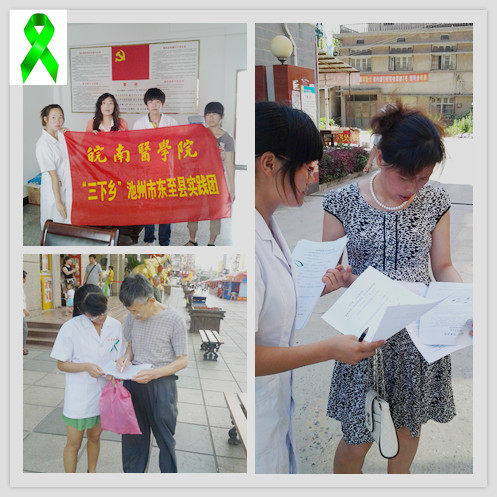 池州市“如何预防夏季常见病”健康知识宣传 7月3日-7月4日,服务队以“心系医学,热爱生活”为主题,在池州东至县大渡口汇隆花园开展了有关“如何预防夏季常见病”的健康知识宣传和问卷调查活动。调查结果显示,大部分人对如何预防夏季常见病(如中暑和急性肠胃炎)都不太了解,家中备有治疗夏季常见病药品的市民也比较少。可见,在夏季开展此类健康知识宣传活动十分必要。