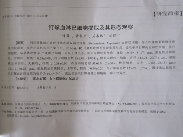 第一作者为太阳成官网2010级许勇同学的学术论文《钉螺血淋巴细胞提取与形态观察》于2013年6月发表在中国科学引文数据库(CSCD)核心库来源期刊《中国寄生虫学与寄生虫病杂志》,该杂志被《医学文献联机数据库》(MEDLINE)收录。他凭借此文又获得了2013年皖南医学院第五届“挑战杯”老员工课外学术科技作品竞赛一等奖。