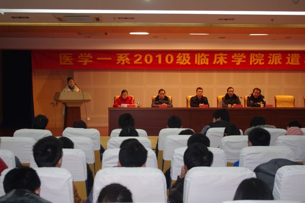 根据学校安排,医学一系2010级21-29班将于2月23日奔赴9所临床学院学习。为切实将此项工作抓紧抓好,确保顺利完成交接,1月18日晚,医学一系在图书馆三楼报告厅召开2010级临床学院派遣动员大会。系党总支副书记韩军、系副主任蒋韶明、系党总支副书记王金权、校保卫处治安科科长周黎明、年级辅导员及2010级21-29班279名同学参加了会议。会议由年级负责人郭玉琼主持。