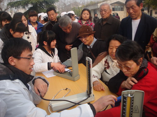 活动中,一部分同学为老人们测量血压,听诊心脏,一部分提供健康知识咨询,并派发了400多份保健知识宣传单,受到了公园内外老人们的支持和配合,同学们分工合作,各司其职,运用自己所学知识,认真热情地为每一位老年人服务,这不仅使同学们实践了书本上的知识,学会了如何和老年人交流,同时也体会到作为一名青年医员工的责任和使命。