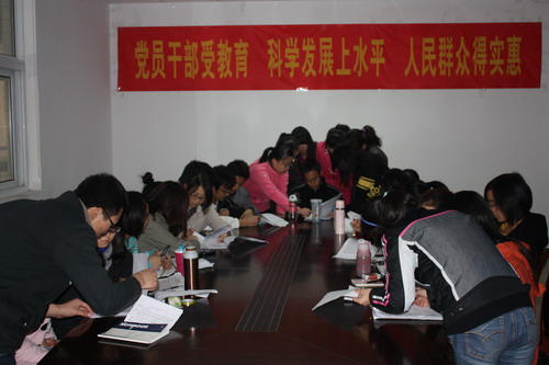 会上,张老师带领大家学习了党建相关文件,要求大家要坚定信念,明确党员的责任与义务,在实践活动中践行创先争优活动的号召。随后,员工党员代表就党员发展程序、党建材料整理等问题做了详细介绍,各位党员发展对象也踊跃发言,认真听取并做好记录。会后,各大班党小组就如何发挥党员先锋模范带头作用,规范建党材料,为创建“红旗党支部”进行了深入的讨论,并寻求建立“一帮一、一带一”的模式,提高支部员工党建工作水平。