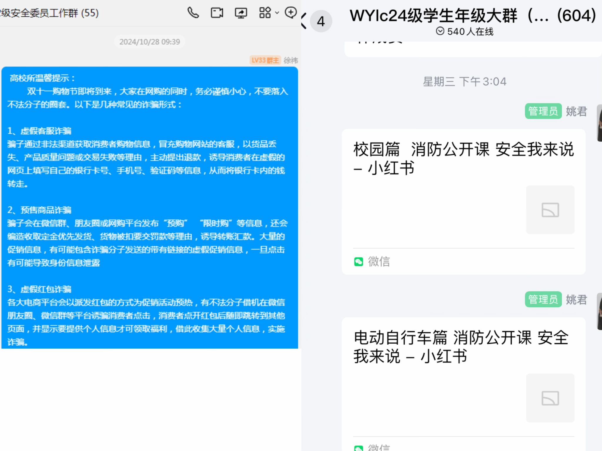 普及安全知识,强化安全宣传。为帮助同学们掌握基本的防诈、消防常识,学院利用公众号、QQ等平台推送发布安全知识,通过具体的案例普及相关防范知识,教育引导员工认识到防诈、消防等各项安全工作的重要性,并在日常学习生活中注意防范隐患。