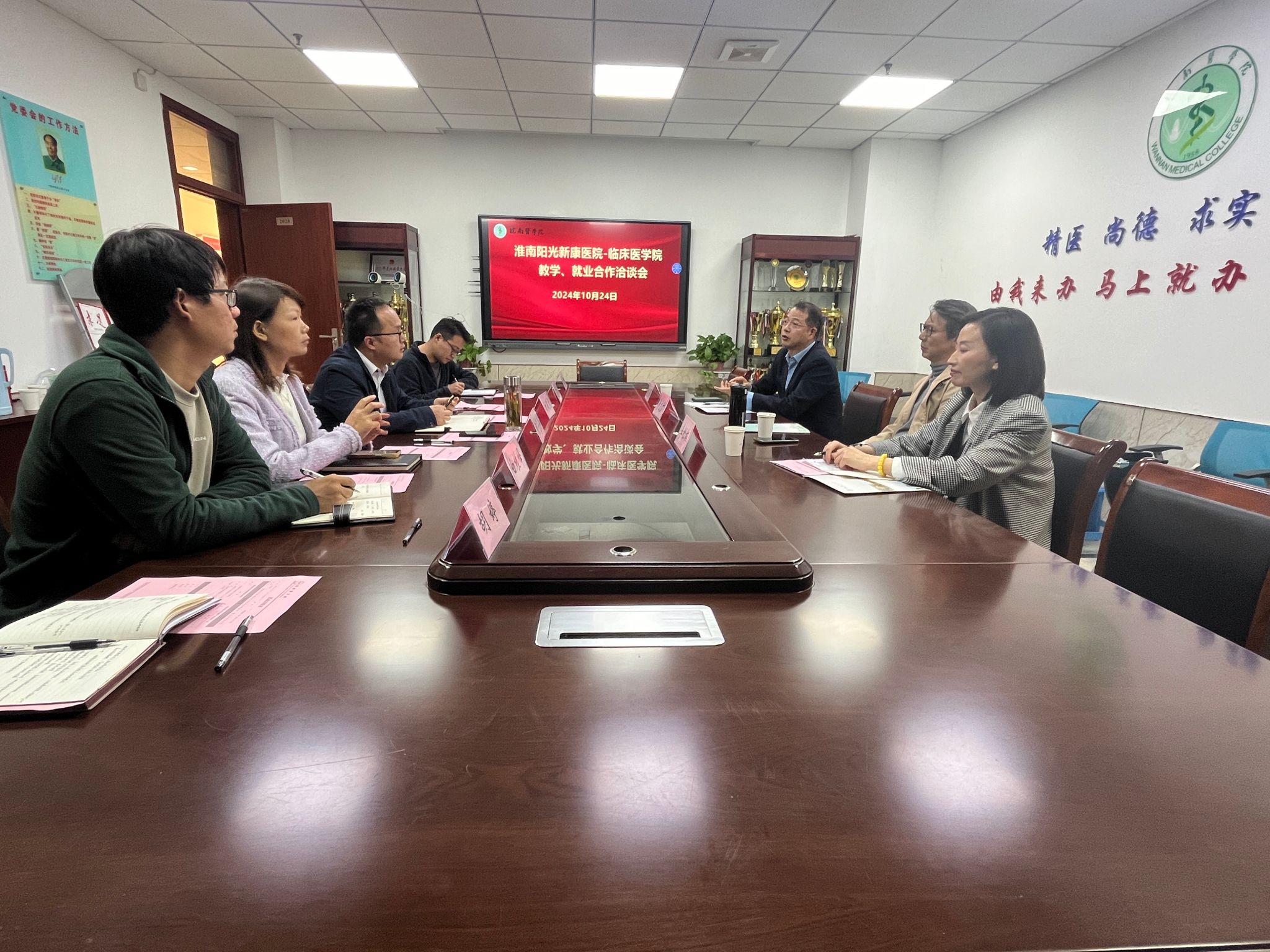 交流会上,方基勇对淮安八十二医公司党委副书记焦峰、淮南阳光新康医院副经理步文广一行的到来表示热烈欢迎,并就太阳成官网基本情况、毕业生整体情况及临床医学专业、康复治疗学专业员工培养情况进行详细介绍。两家医院分别介绍了各自医院发展、科室建设、人才需求及培养等情况,双方围绕员工教学、就业合作等方面进行深入交流。
