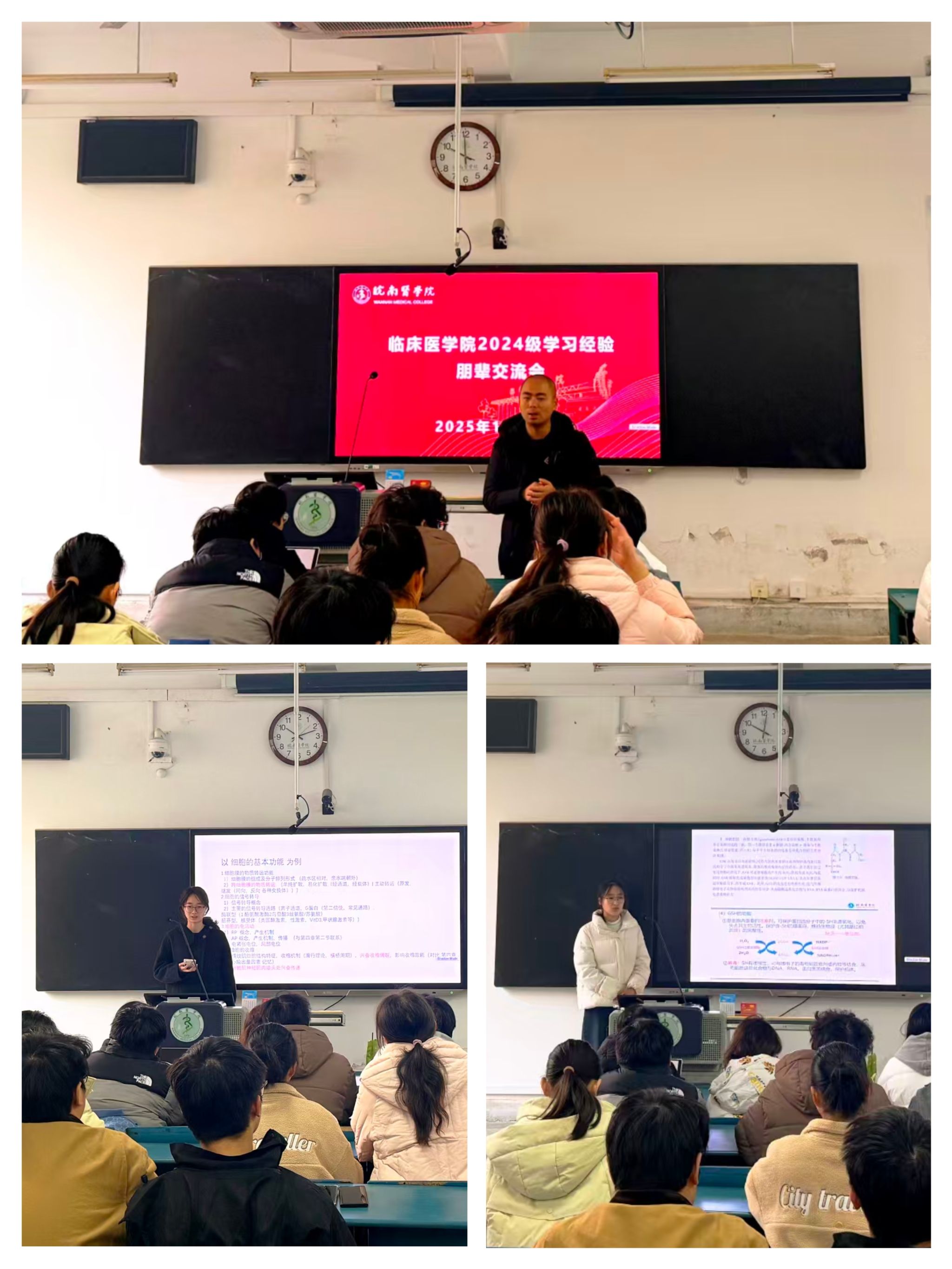 学习经验朋辈交流会围绕《生理学》和《生物化学与分子生物学》课程开展专题分享,2024级刘雪婷和江琳琳两位同学担任主讲人。刘雪婷以《生理学》结合自身学习笔记,分享了“分系统构建知识框架”的学习方法,并针对课堂笔记整理、课后习题复盘等环节给出建议。江琳琳则聚焦《生物化学与分子生物学》抽象概念多的特点,演示如何用流程图简化概念,让抽象知识变得直观易懂,同时分享了利用碎片化时间复习的经验。在互动提问环节,同学们围绕“如何平衡两门课程的学习时间”“复杂知识点记不住怎么办”等问题积极提问,刘雪婷、江琳琳结合自身经历逐一解答。辅导员陶绍晨在总结中强调,基础医学课程是后续专业学习的基石,希望同学们以此次交流会为契机,借鉴优秀经验,找到适合自己的学习节奏。