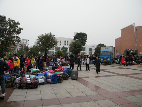 1月5日上午10时开始,在新校区综合服务中心广场一派热火朝天的景象,2007级全体同学冒着严寒,在系党总支副书记韩军、副主任蒋韶明、系秘书李曙及07级辅导员张琪琪、李海莉的指挥下紧张有序地搬运行李,灿烂的笑容,匆匆的脚步,互帮互助的场景,充满了浓浓的师生情、同窗情。到下午16时10部车陆续发往30多所教学、实习医院,沿途接送下实习点和返校员工行李。