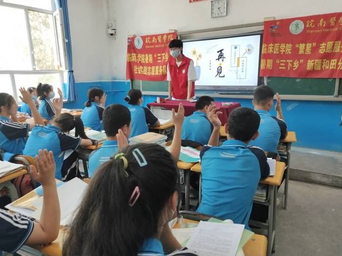 为将民族团结的火种播撒在青少年人群中,6月30日上午,实践团前往和田县拉依喀乡中学。队员们结合自身在皖医的老员工活体验,开展民族团结筑梦中华主题宣讲、中员工与中国梦主题互动交流、高考志愿填报咨询答疑等活动。在场的大、中员工积极互动讨论,畅谈民族团结的重要性和青少年的责任与担当,共同走进了一堂精彩的“民族团结”思政课。