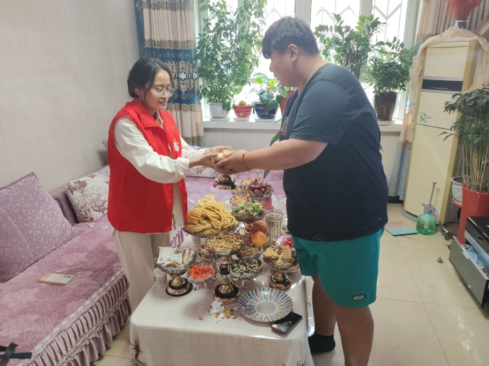 实践活动开展期间,恰逢少数民族传统节日——古尔邦节,节日期间家家户户热闹非凡,实践队员们受邀前往少数民族群众家中拜访交流,受到了当地群众的热情招待。7月14日下午,志愿者们带着真心、真情,向“家人们”送上礼物祝福,与他们围坐在一起拉家常、话民生,营造了浓厚的民族团结氛围。